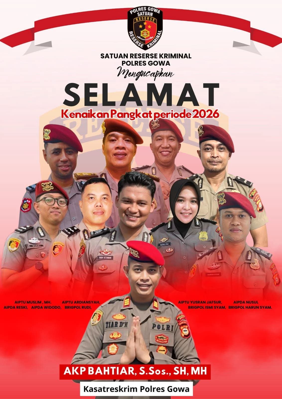Upacara dipimpin langsung oleh Kapolres Gowa AKBP Muhammad Aldy Sulaiman, S.I.K., M.Si. dan dihadiri oleh Wakapolres Gowa KOMPOL Gani, S.H., M.H., para Pejabat Utama (PJU), para Kapolsek jajaran, serta Ketua Bhayangkari Cabang Gowa Ny. Aldy beserta pengurus Bhayangkari, ASN, dan seluruh personel Polres Gowa.