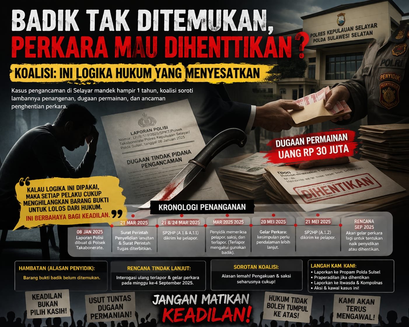 Koalisi menegaskan bahwa jika perkara ini dihentikan dengan alasan yang lemah, maka hal tersebut merupakan bentuk kegagalan penegakan hukum.