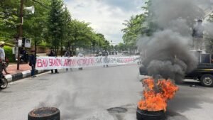 Selain orasi, massa membentangkan spanduk panjang yang memblokade jalan sebagai simbol bahwa kepercayaan publik sedang “terhambat” oleh kaburnya transparansi. Asap hitam dari pembakaran ban membubung tinggi, menandakan panasnya tensi sosial di tengah masyarakat Gowa saat ini.