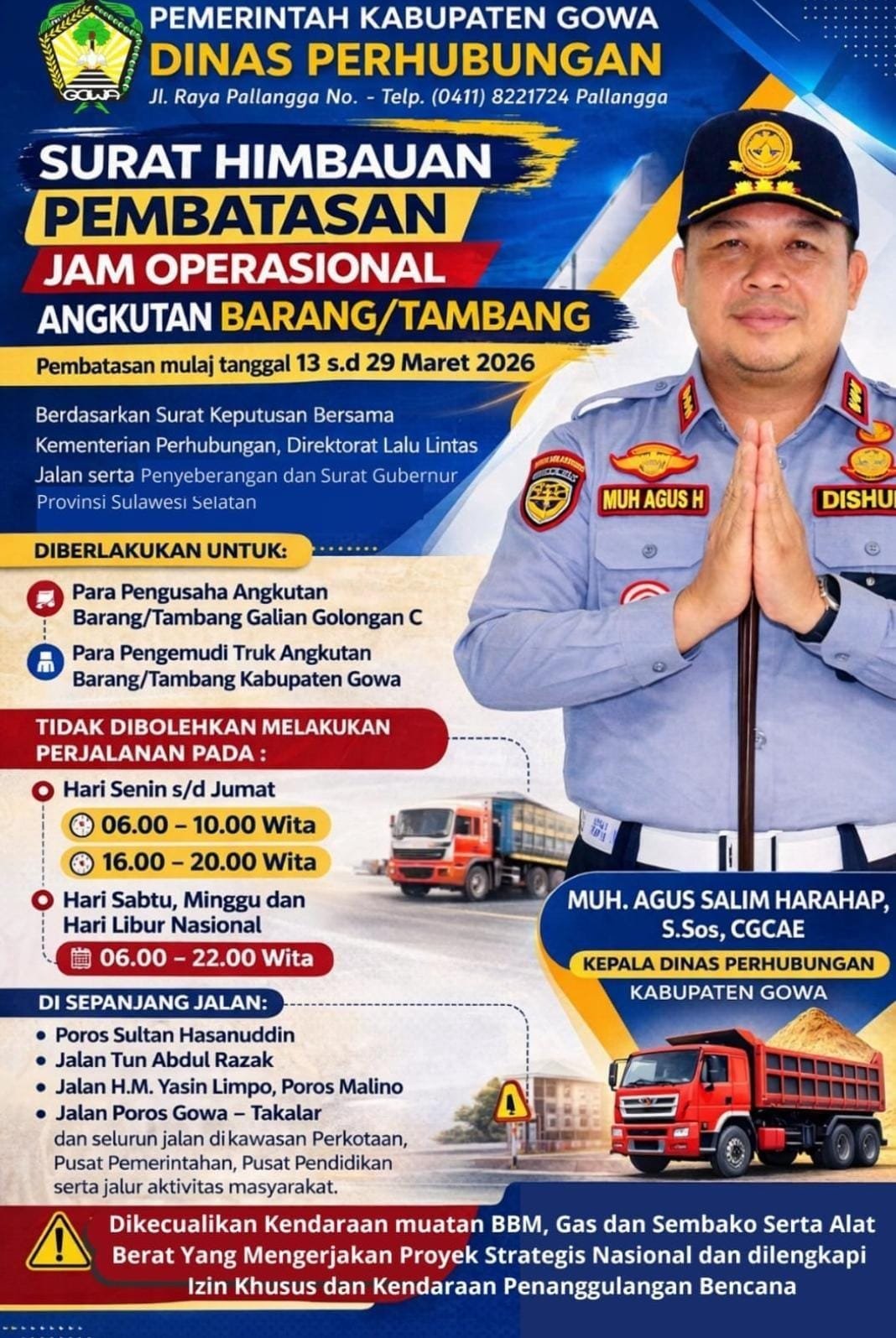 GOWA | TUBARANIA.COM& Pemerintah Kabupaten Gowa melalui Dinas Perhubungan resmi memberlakukan pembatasan jam operasional bagi kendaraan angkutan barang dan truk tambang galian C di sejumlah ruas jalan utama di wilayah Kabupaten Gowa.