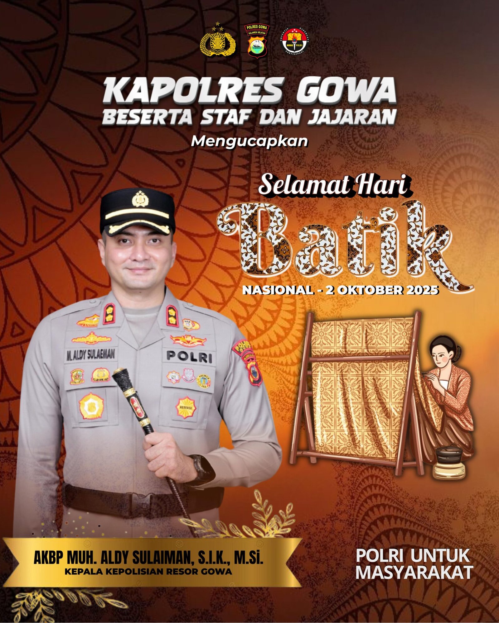 Tubarania.com, Gowa – Kapolres Gowa AKBP Muhammad Aldy Sulaiman, S.I.K., M.Si., beserta seluruh staf dan jajaran Polres Gowa menyampaikan ucapan Selamat Hari Batik Nasional kepada seluruh masyarakat Indonesia, Kamis (2/10/2025).