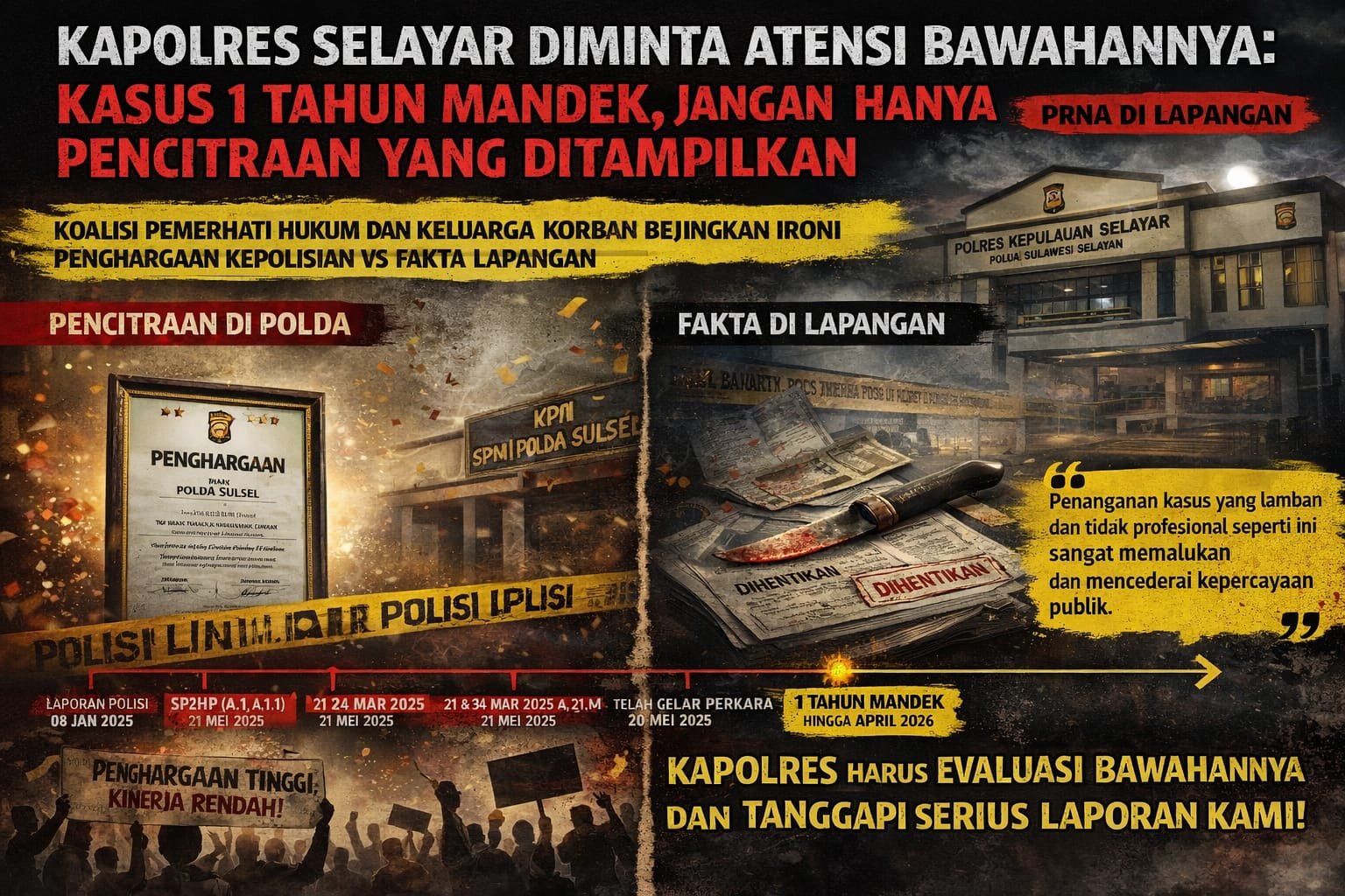 Koalisi menyoroti adanya ironi dalam institusi kepolisian di wilayah tersebut. Di satu sisi, Polres Kepulauan Selayar diketahui menerima penghargaan di tingkat Polda. Namun di sisi lain, penanganan kasus ini justru menunjukkan kondisi yang bertolak belakang.