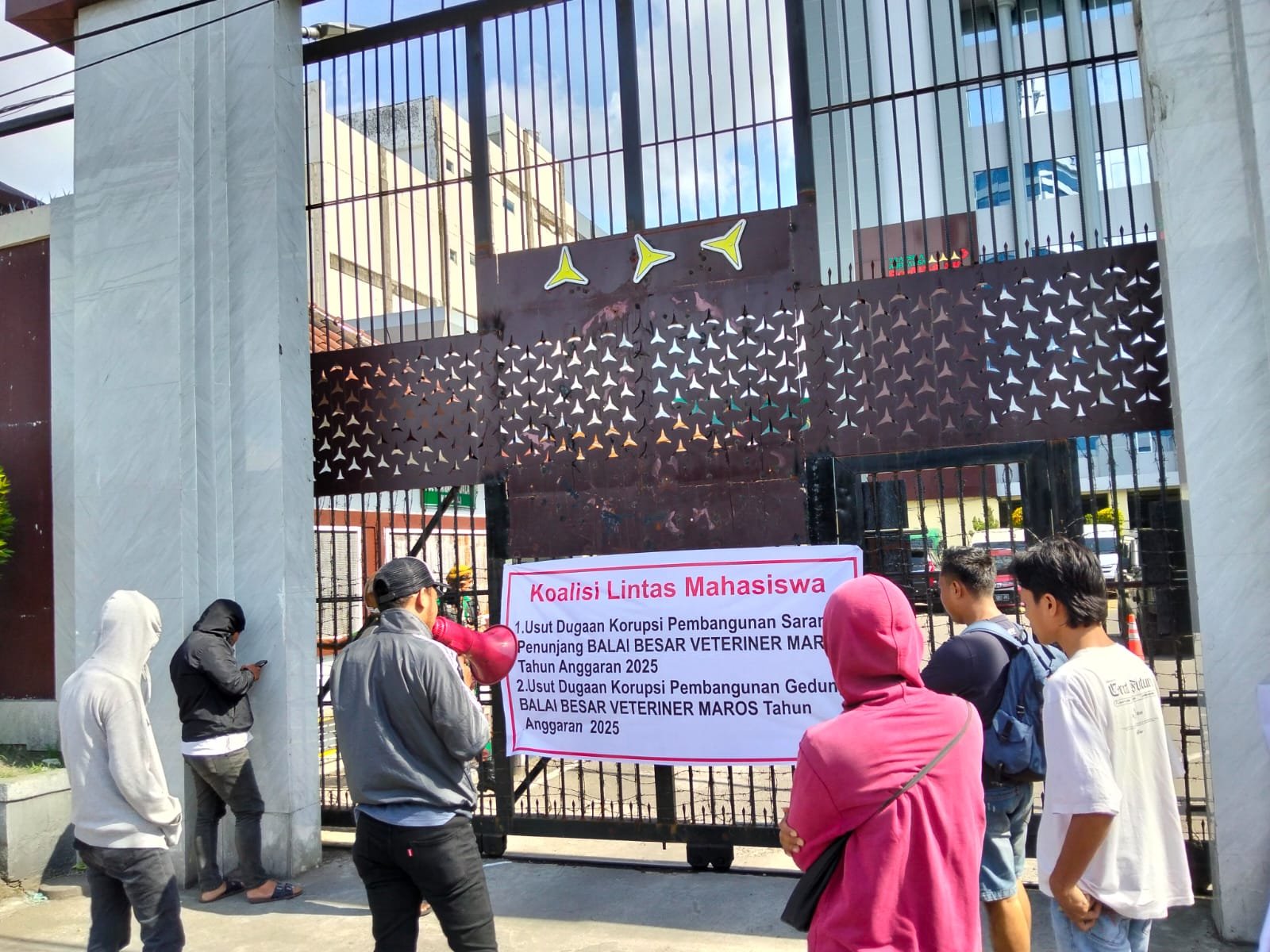 MAKASSAR | TUBARANIA.COM- Koalisi Lintas Mahasiswa menggelar aksi unjuk rasa di depan kantor Kejaksaan Tinggi Sulawesi Selatan sebagai bentuk desakan terhadap aparat penegak hukum untuk segera mengusut dugaan tindak pidana korupsi pada proyek Balai Besar Veteriner Maros Sulawesi Selatan Tahun Anggaran 2025. Aksi tersebut dipimpin langsung oleh Raiz selaku jenderal lapangan.