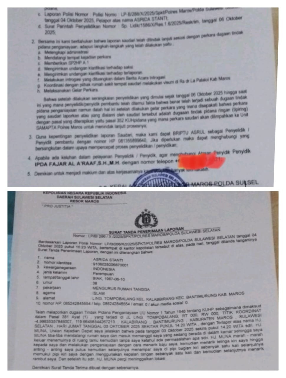 Kasus ini teregister dengan Nomor: LP/B/167/X/2025/SPKT/Polres Maros/Polda Sulsel, tertanggal 4 Oktober 2025. Berdasarkan laporan, terlapor diduga memasuki rumah korban tanpa izin, kemudian melakukan tindakan kekerasan yang menyebabkan telinga korban mengalami gangguan pendengaran serta merusak perhiasan emas (anting-anting) milik korban.