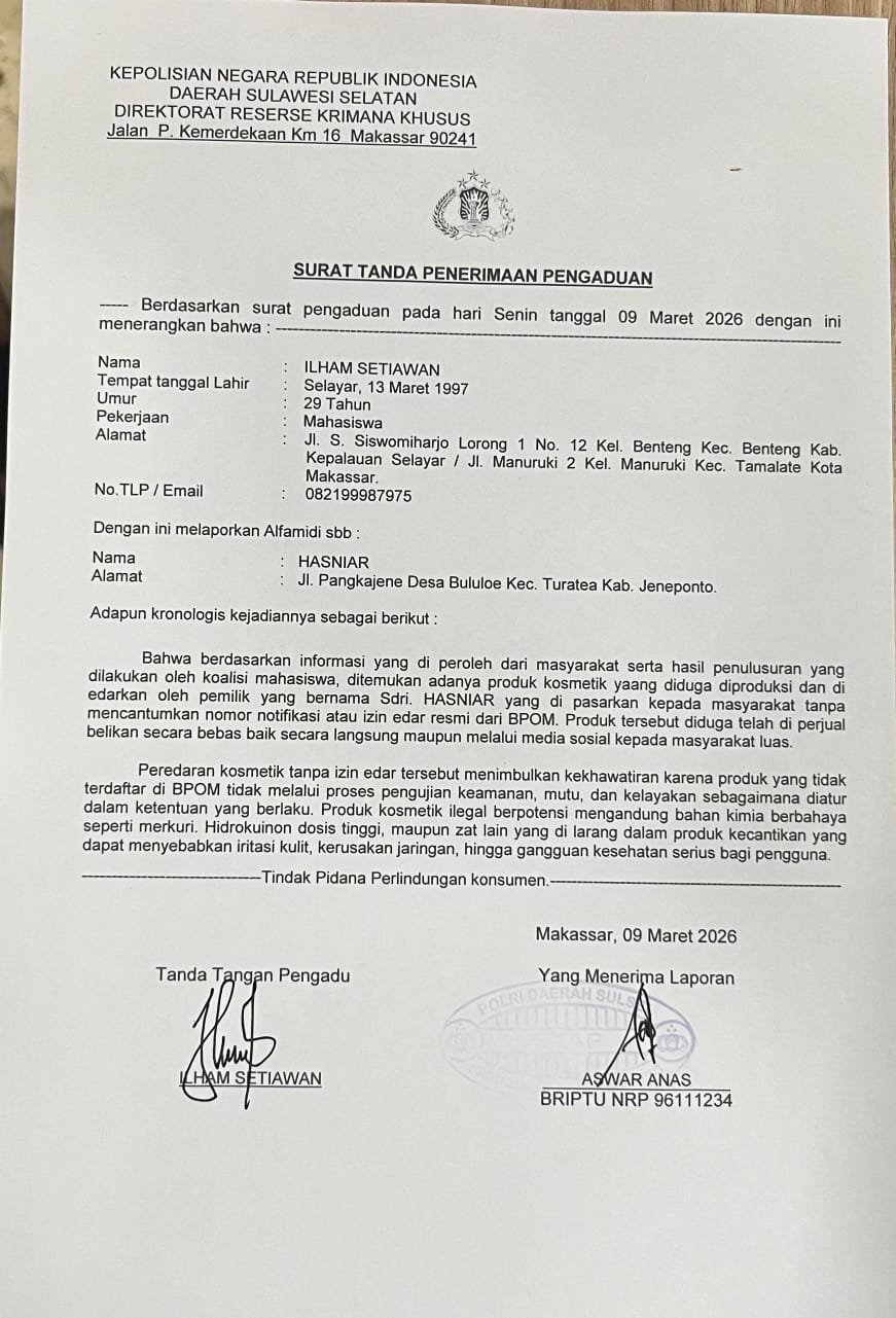 MAKASSAR | TUBARANIAN.COM– Dugaan peredaran produk kosmetik ilegal yang tidak memiliki izin edar dari Badan Pengawas Obat dan Makanan (BPOM) resmi dilaporkan ke Direktorat Reserse Kriminal Khusus Polda Sulawesi Selatan oleh seorang mahasiswa bernama Ilham Setiawan. Laporan tersebut telah diterima oleh pihak kepolisian dan tercatat dalam Surat Tanda Penerimaan Pengaduan pada Senin, 9 Maret 2026 di Makassar.