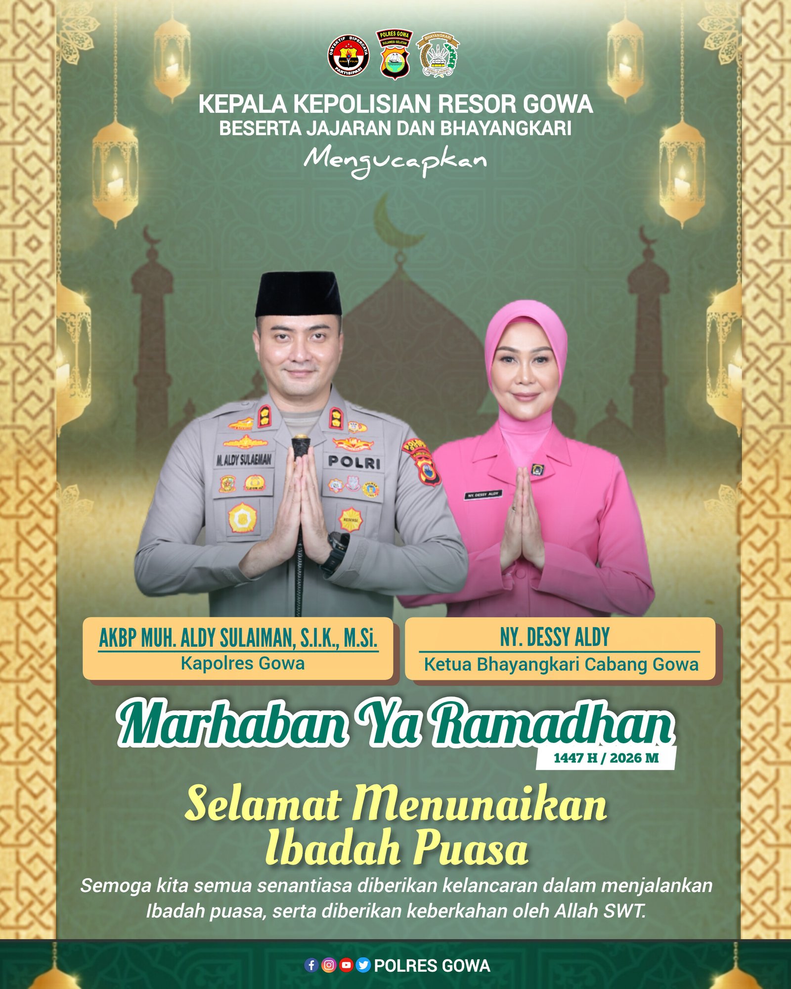 โAtas nama pribadi, keluarga besar Polres Gowa dan Bhayangkari, kami mengucapkan “Marhaban Ya Ramadhan” 1447 H/2026 M. Selamat menunaikan ibadah puasa. Semoga Allah SWT senantiasa melimpahkan rahmat, ampunan dan keberkahan-Nya kepada kita semua,โ ujar AKBP Muh. Aldy Sulaiman.