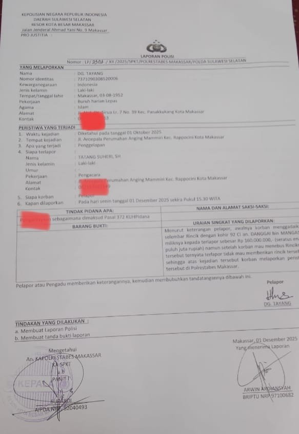 Tubarania.com-Makassar, 1 Desember 2025 —Seorang warga Kota Makassar bernama Dg. Tayang resmi melaporkan dugaan tindak pidana penggelapan ke Polrestabes Makassar. Laporan tersebut teregistrasi dengan nomor LP/2303/XII/2025/SPKT/Polrestabes Makassar/Polda Sulawesi Selatan.