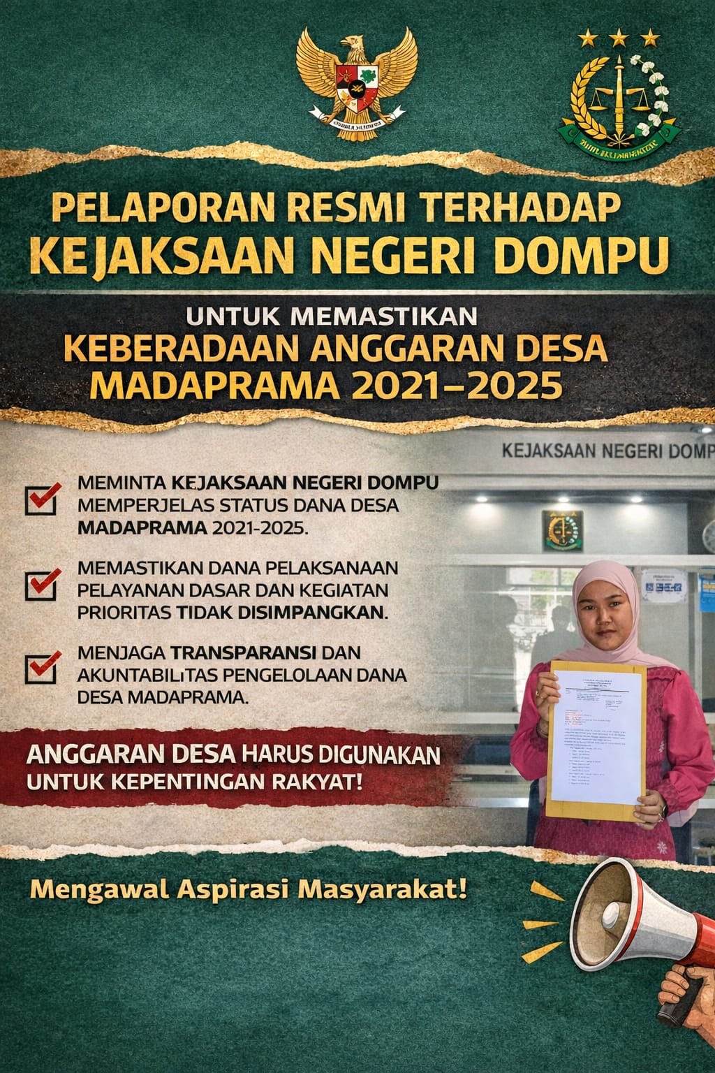 DOMPU | TUBARANIA.COM – Aladin, pemuda asli Desa Madaprama, Kabupaten Dompu, resmi melayangkan laporan ke Kejaksaan Negeri Dompu terkait dugaan penyimpangan pengelolaan Anggaran Dana Desa Madaprama periode 2021–2025. Langkah hukum tersebut ditempuh untuk memastikan transparansi serta akuntabilitas penggunaan dana desa yang dinilai belum memberikan kejelasan kepada masyarakat.