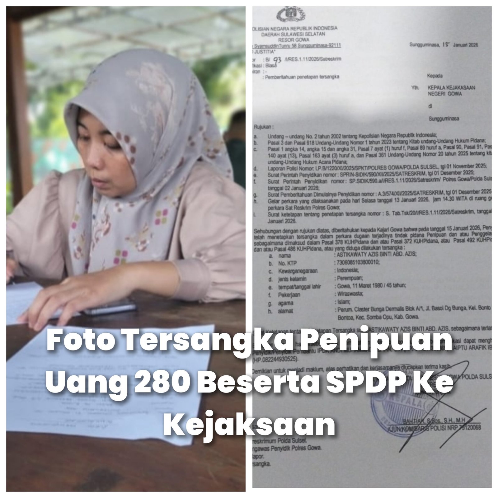 Setelah merasa keberatan dan tidak mendapatkan solusi yang jelas, korban akhirnya melaporkan kasus ini ke pihak berwenang melalui Laporan Polisi Nomor: LP/B/1220/X1/2025/SPKT/POLRES GOWA/POLDA SULAWESI SELATAN. Hasilnya, sejak hari Senin (20/1), Astikawati Aziz telah resmi ditetapkan sebagai tersangka.