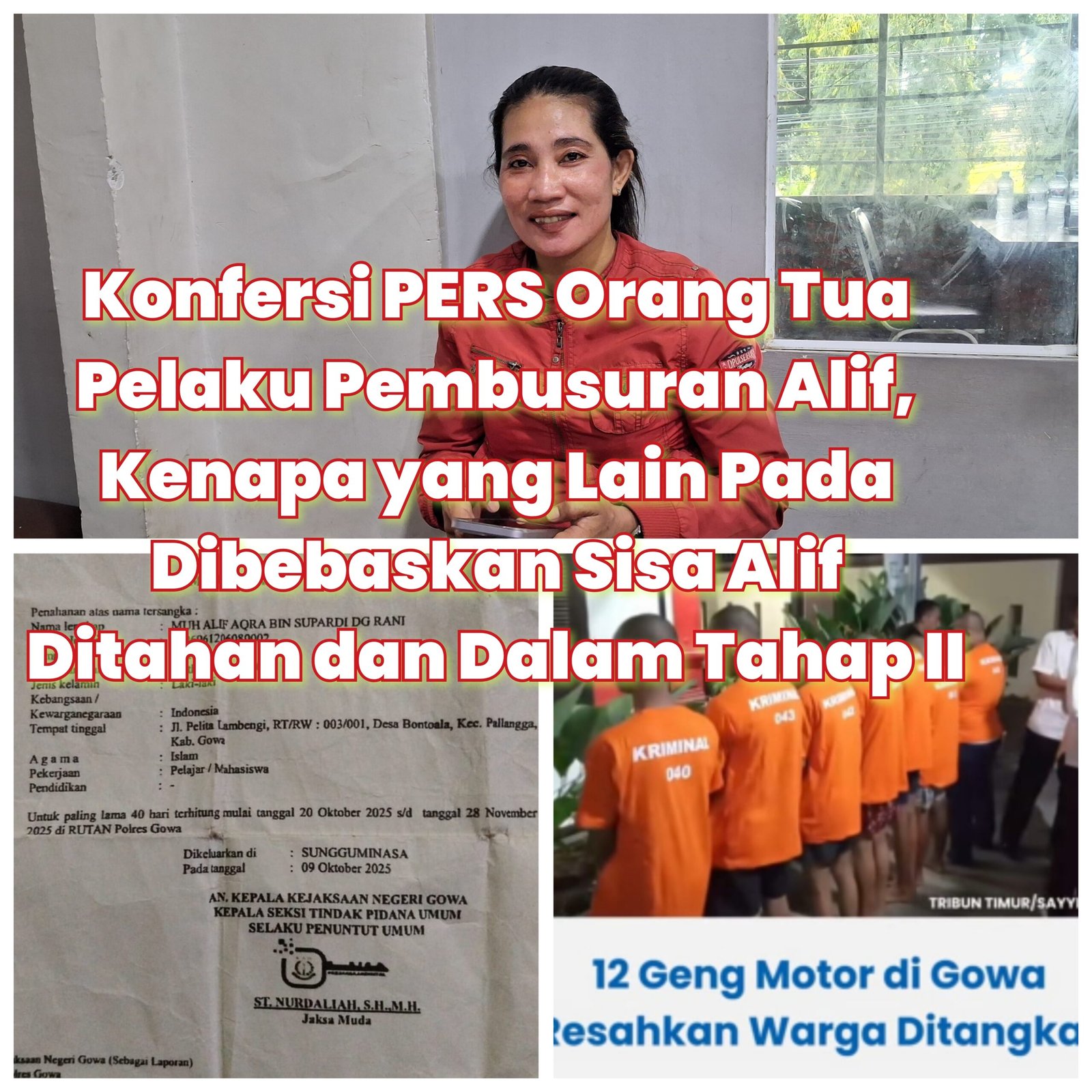 “Pernyataan ibu Alif sebagai  tersangka dalam kasus pembusuran jalan dirgantara pallangga bahwa anak saya Alif bukan pelaku utama dan tidak memiliki barang bukti apa pun sedangkan pelaku utama yang 4 orang itu dibebaskan,ungkap orang tua pelaku Alif (25/1/2026)”.