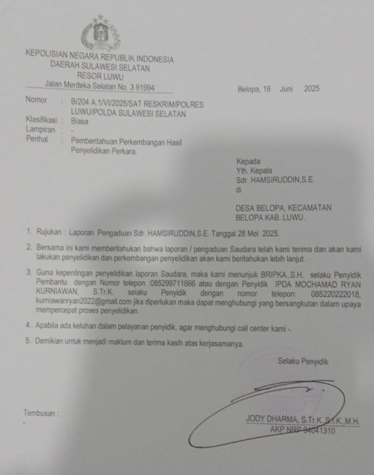 Hingga berita ini terbit kami belum mendapatkan tanggapan Kapolres dan Kasat Reskrim Polres Luwu.