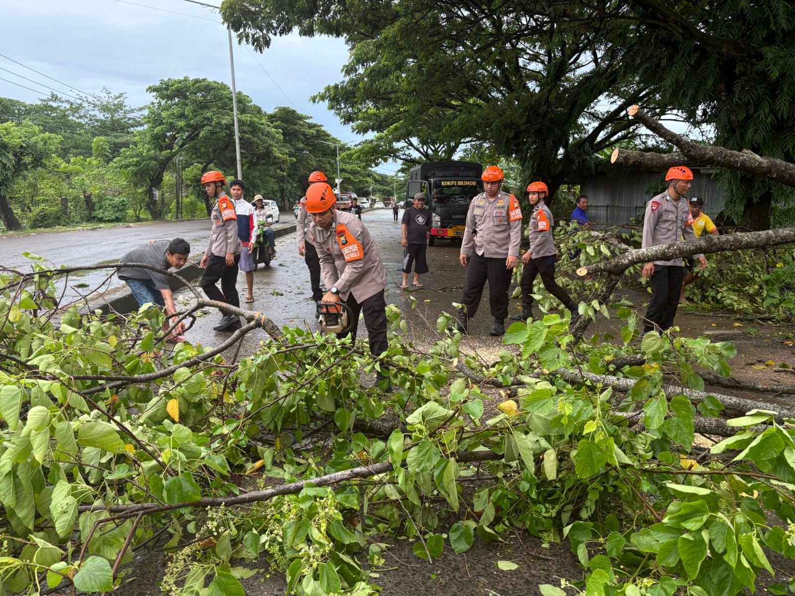 Pohon tumbang tersebut terjadi akibat kondisi cuaca yang kurang bersahabat dan berpotensi membahayakan pengguna jalan karena menutup sebagian badan jalan utama yang menghubungkan Kabupaten Barru dan Kota Makassar. Menindaklanjuti laporan masyarakat, Tim SAR Batalyon B Pelopor segera diterjunkan ke lokasi untuk melakukan penanganan.