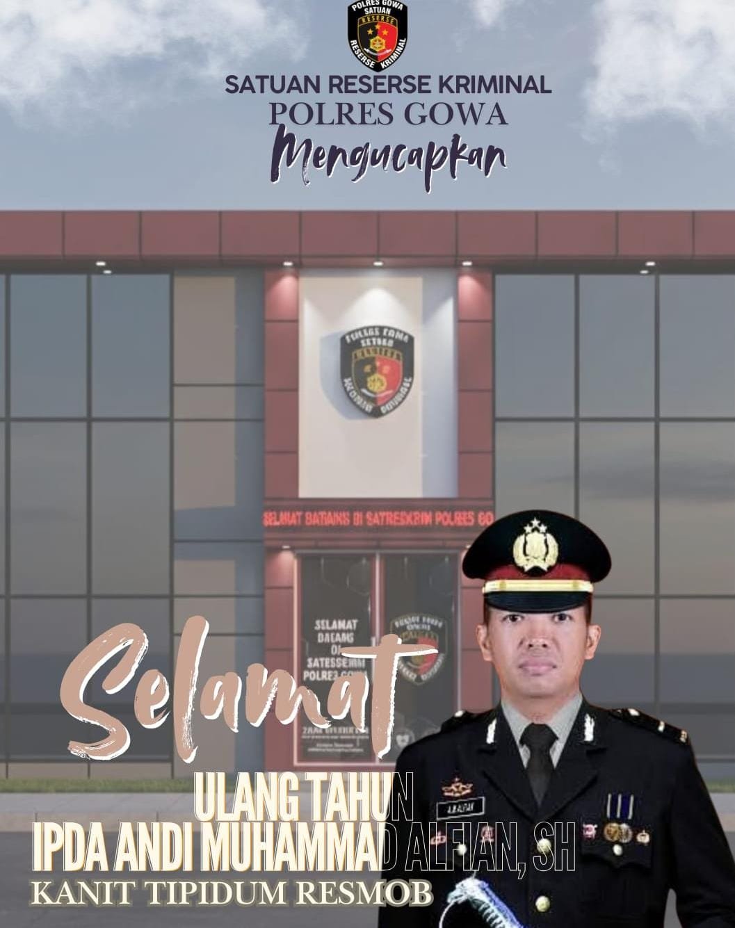 GOWA | TUBARANIA.COM– Perwira menengah Korps Kepolisian Republik Indonesia (Polri) yang menjabat sebagai Kepala Satuan Reserse Kriminal (Kanit Reskrim) Polres Gowa, Ipda Andi Muhammad Alfian SH, memperingati hari ulang tahunnya yang ke-39 pada hari ini, 6 Februari 2026.